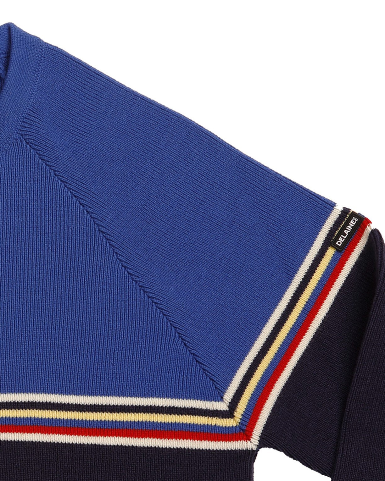 This classic blue over blue vintage men's crew wool ski sweater features a raglan sleeve, providing flexible shoulder mobility and more underarm room. The bold styling with the signature Delaine stripes on the chest and cuff, is similar to the one the founder had in 1976 - the sweater that got this all started.