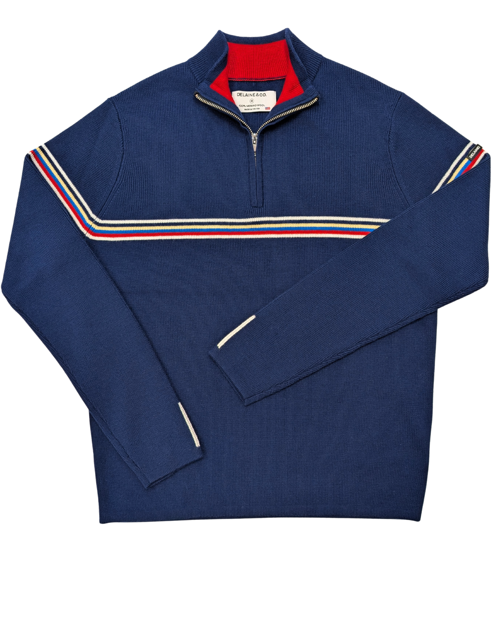 The Carver navy blue quarter zip ski sweater features classic style with signature Delaine chest and cuff stripes.  Crafted in tightly knit Zegna Baruffa merino, this one looks as good around town as it does on the slopes.