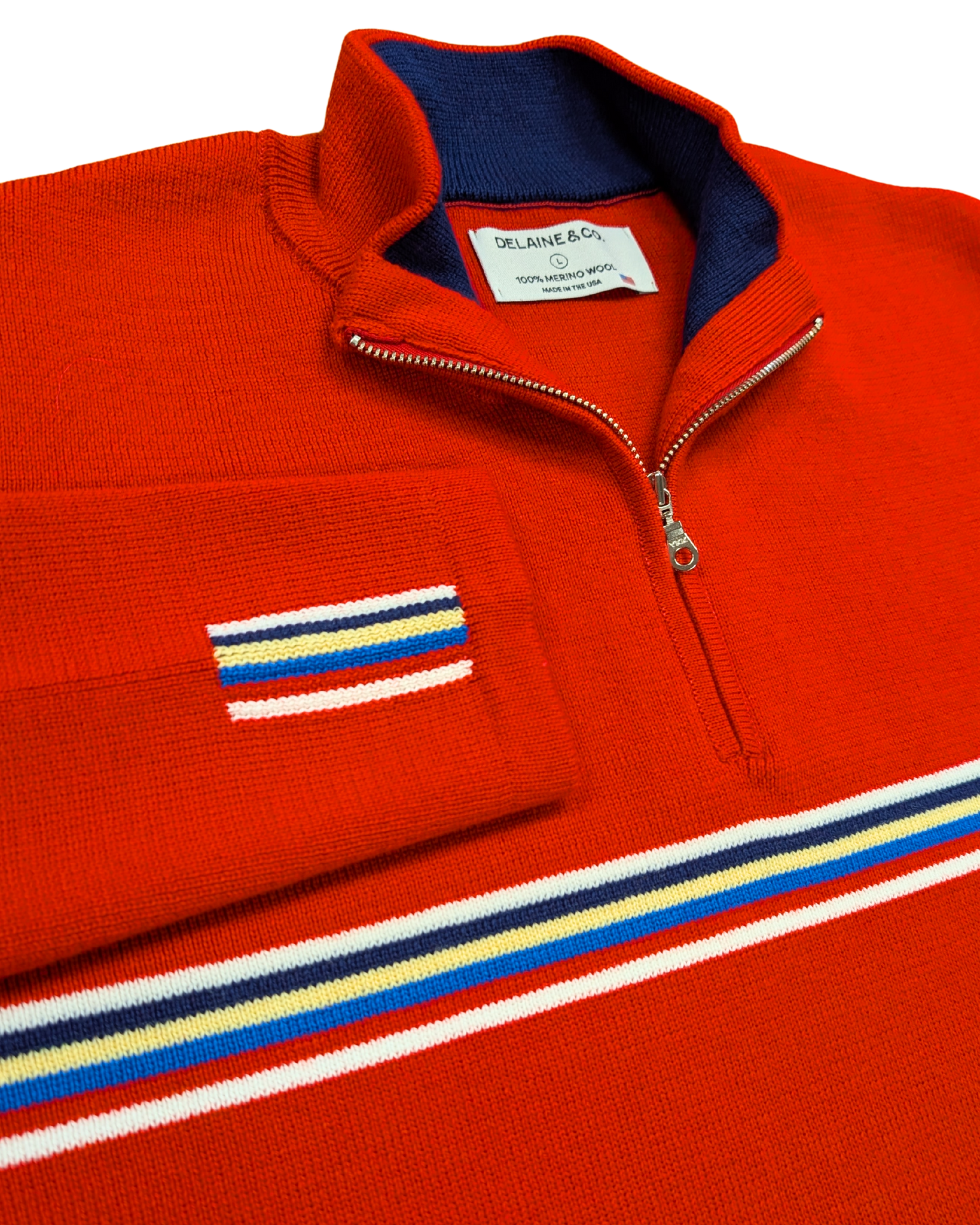 The Carver quarter-zip ski sweater combines classic style with Delaine’s signature chest and cuff stripes. Knit in Italian Zegna Baruffa fine merino, this Downhill Red edition is one of Delaine’s most striking men’s sweaters. Olympic gold medalist Phil Mahre likes this one!