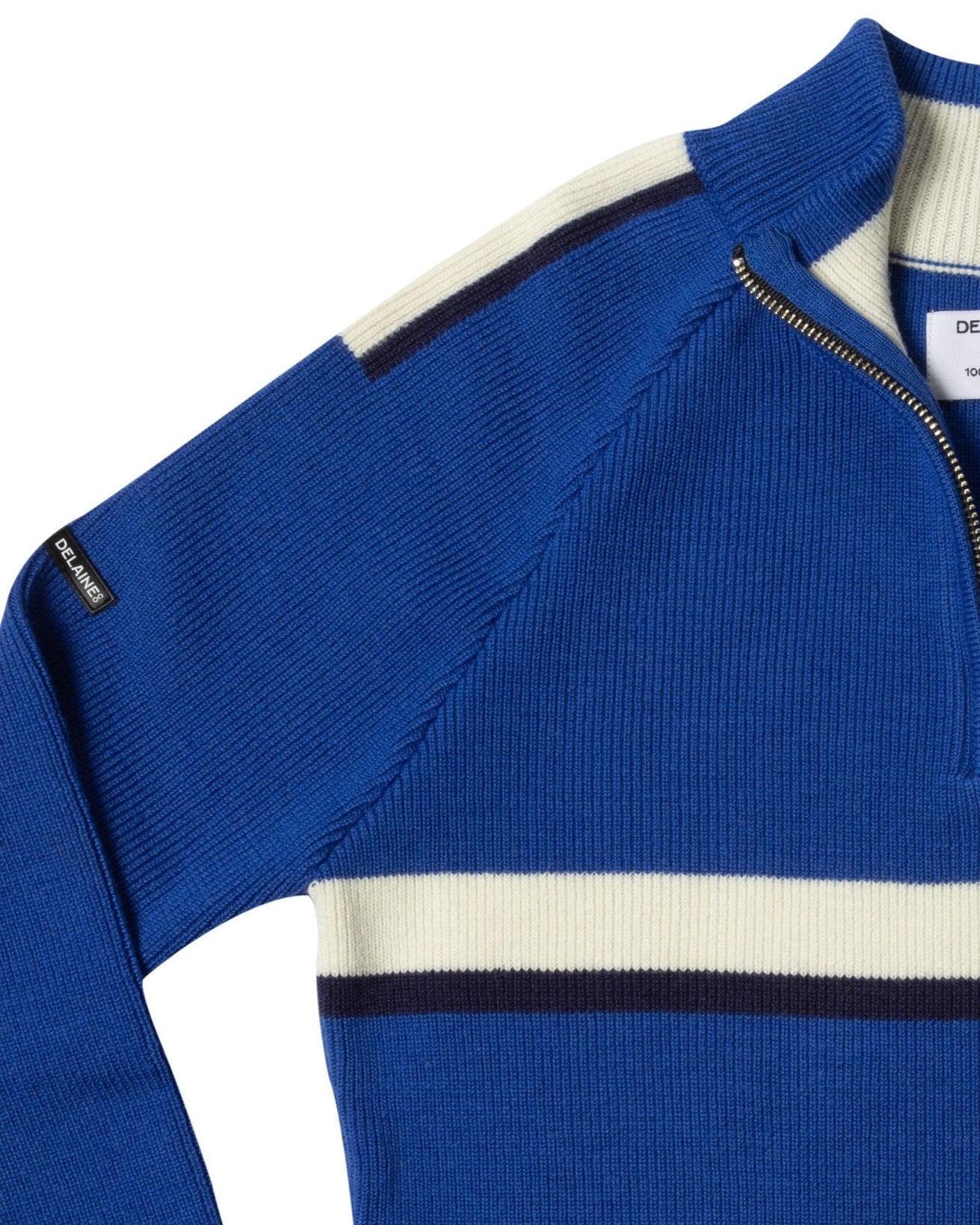 Delaine women's ski sweater - Downhill Racer collection. This sporty, mid-layer combines the best in comfort and style. The Racer features a quarter-zip collar and raglan sleeve construction for maximum comfort, with bold shoulder, chest, cuff accents for style. A popular 1969 movie about an Olympic downhill racer is the inspiration for Delaine's latest collection.