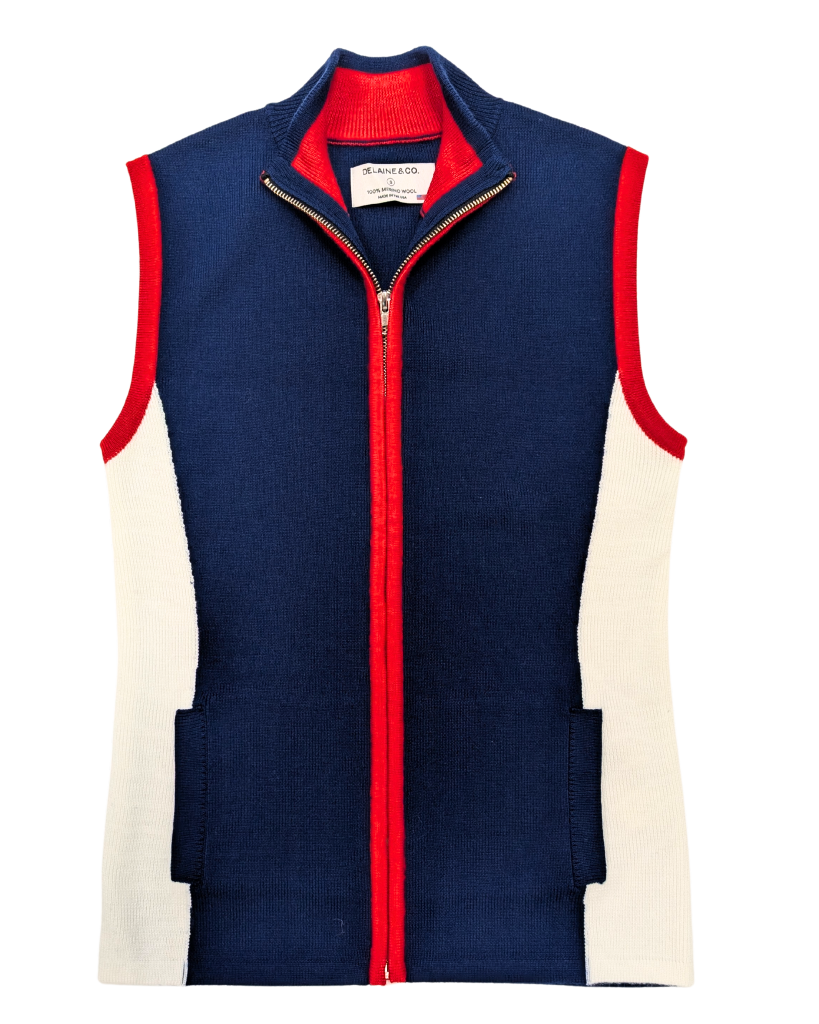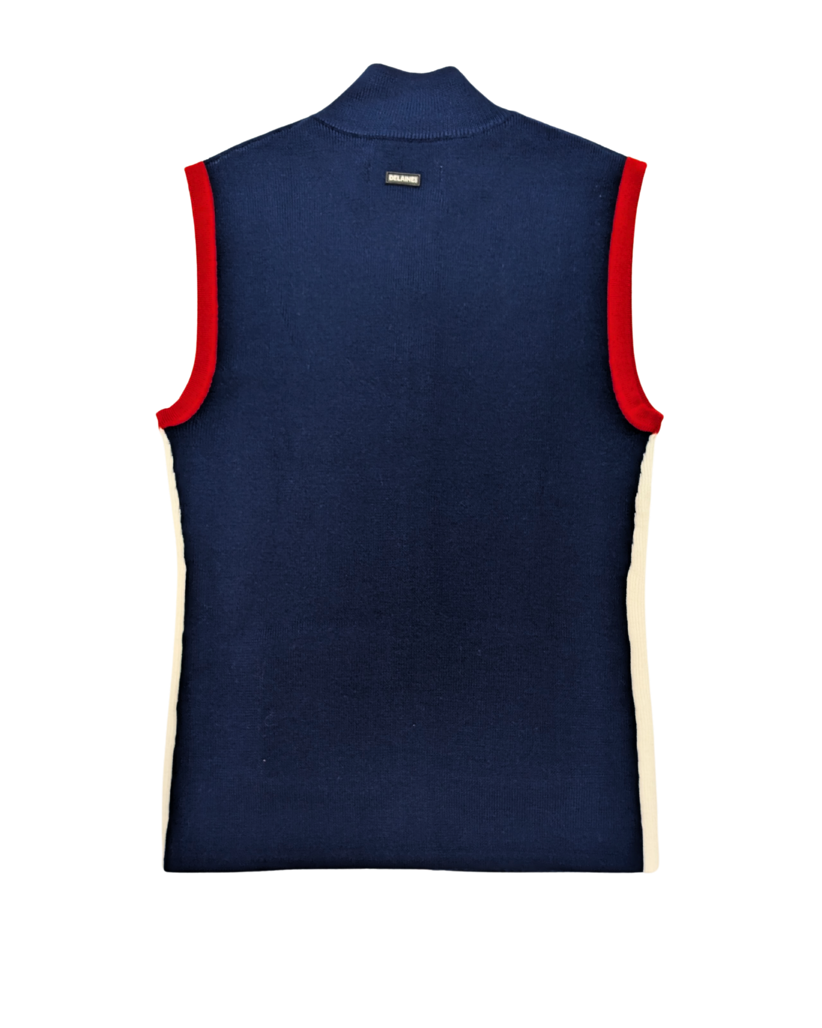 The Downhill Racer Vest by Delaine & Co. is a modern take on classic ski style. Knitted with premium Italian Zegna Baruffa merino wool, it offers natural warmth, breathability, and a refined look—without relying on synthetics. The sleek fit, ivory side panels, and bold trim give it a sharp, feminine edge. With a full-zip front and practical pockets, it layers easily for the slopes or adds sporty polish to everyday winter outfits.